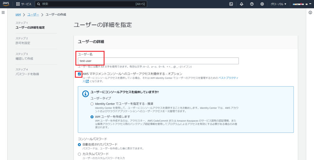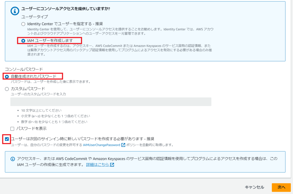 ユーザー名を入力後は、直下の「AWSマネジメントコンソールへのユーザーアクセスを指定する」のチェックを入れましょう。