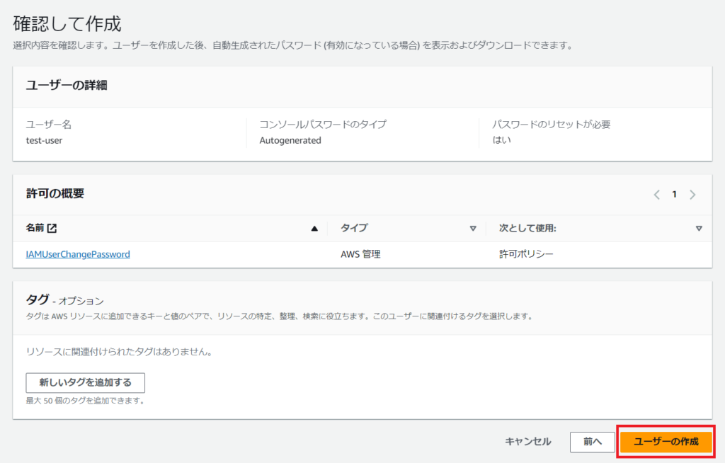 タグは、IAMユーザーが大量に作成された場合の管理用に利用するものですが、今回は一つ作成しただけなので、ここは省略します。