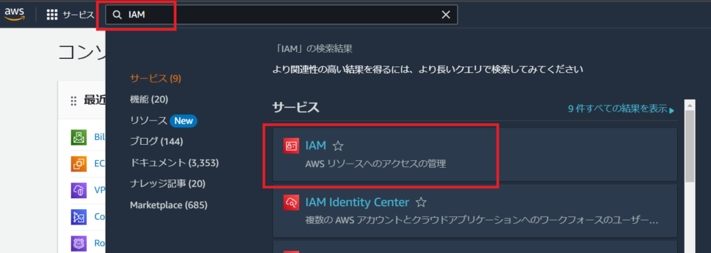 ルートユーザーでログイン後、マネジメントコンソール画面上部の検索ボックスに”IAM”と入力して検索することで、