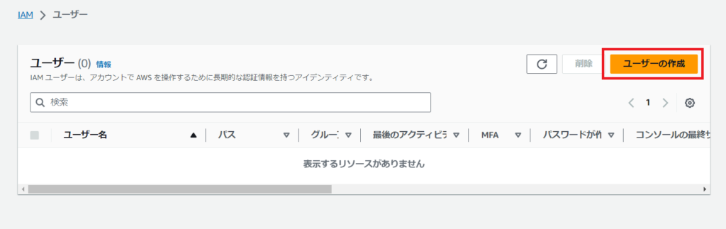 IAMユーザーを作成している場合は、この画面にユーザー名の一覧が表示されるのですが、この時点では、まだIAMユーザーがいない状態ですね。