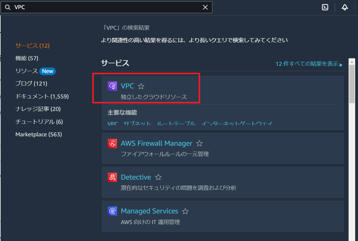 まずはマネジメントコンソール画面にて、検索ボックスに「VPC」と入力してください。