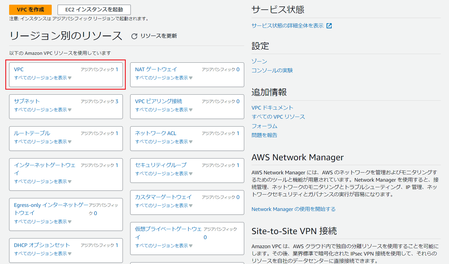 VPCへのリンクをクリックすると、上記のVPCダッシュボード画面に移動します。