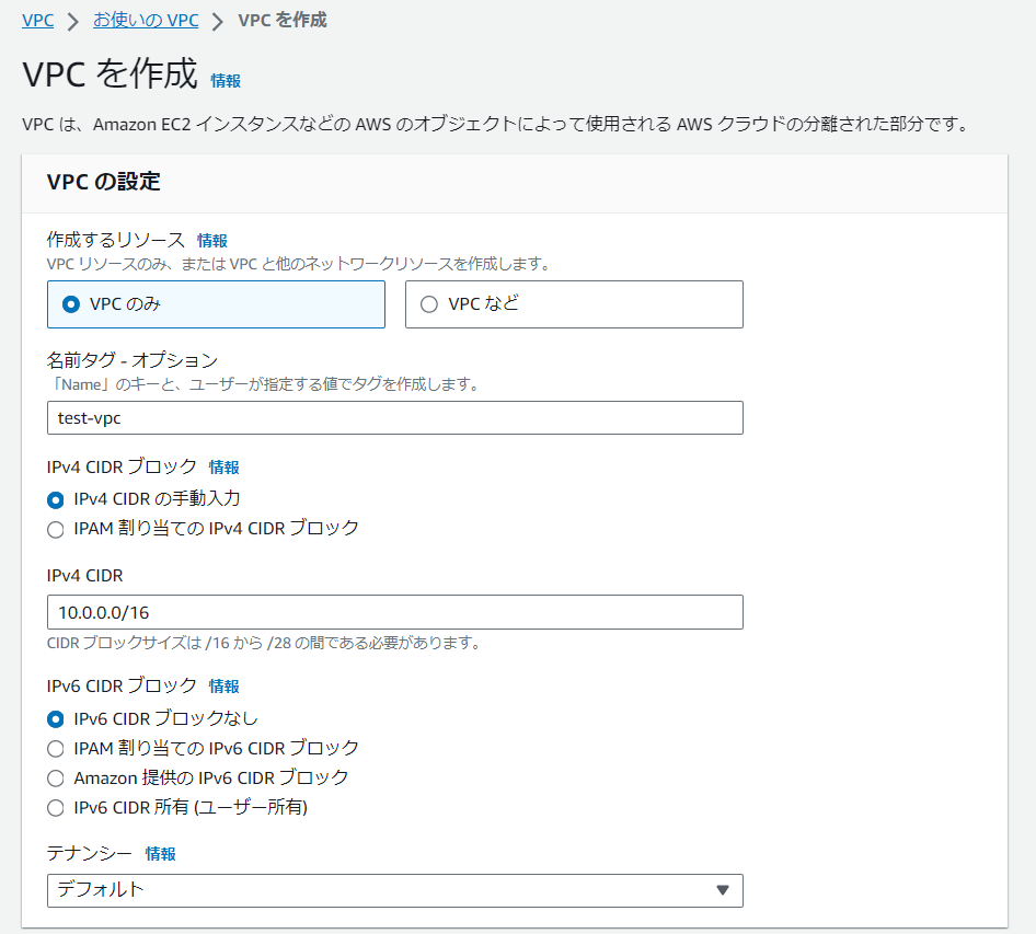 作成するリソースは「VPCのみ」。名前は任意ですが、今回は「test-vpc」とします。