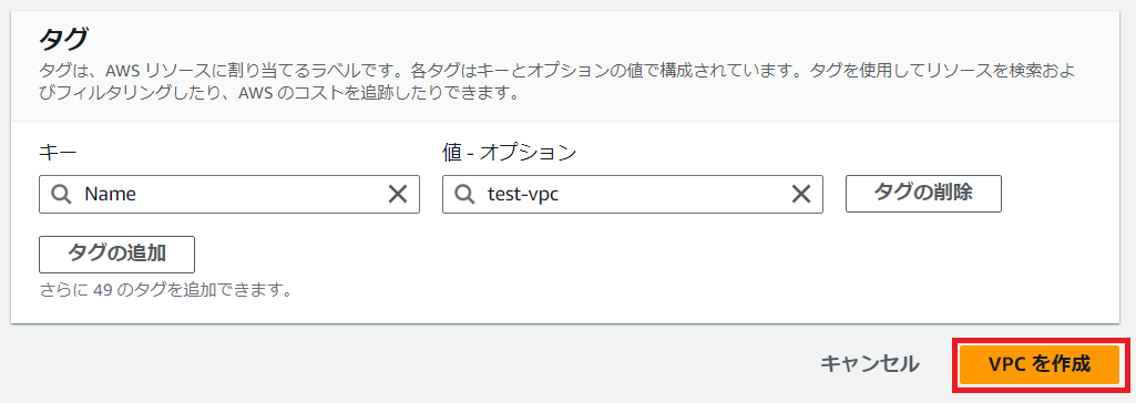 名前やIPv4 CIDRなど、各種設定が終わったら「VPCを作成」をクリックします。