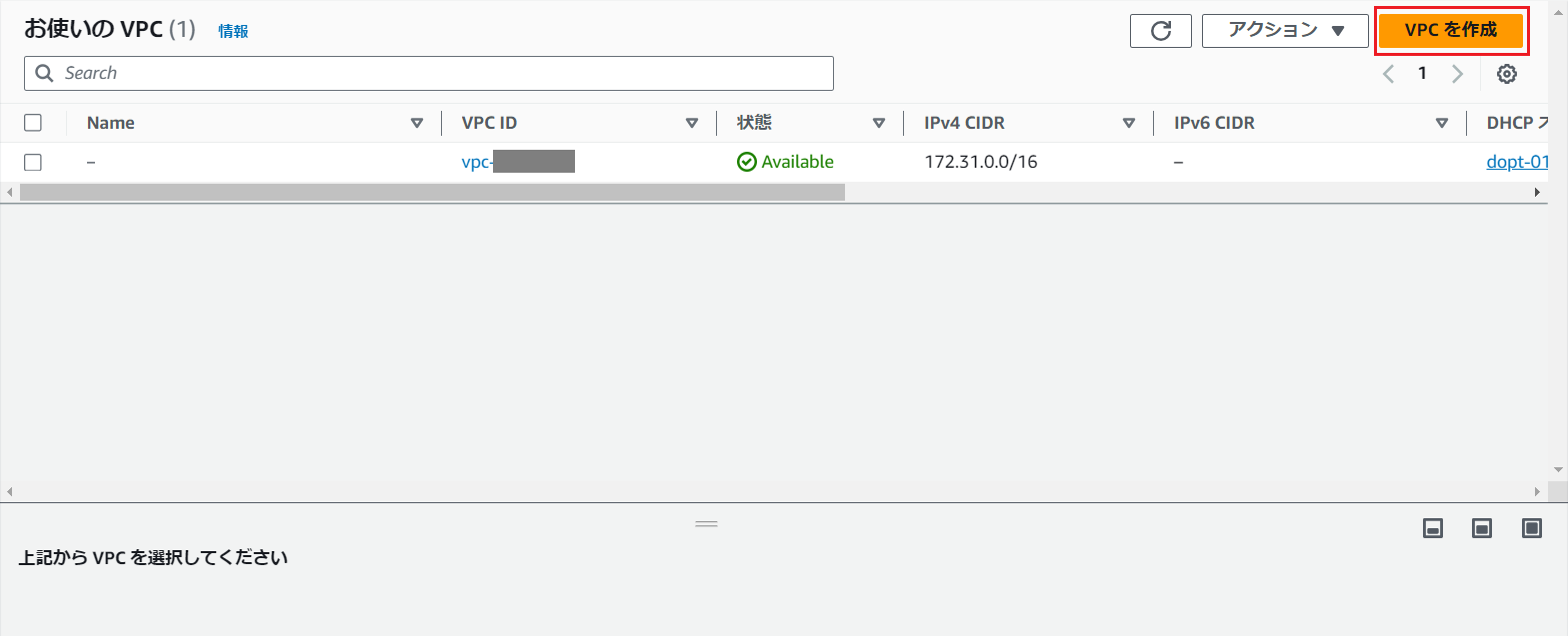 VPCの一覧画面では、サインイン中のユーザーが管理しているVPCの一覧が表示されます。