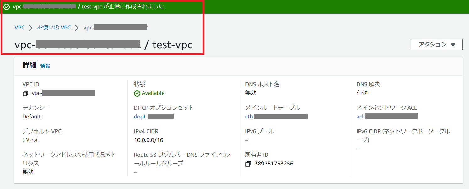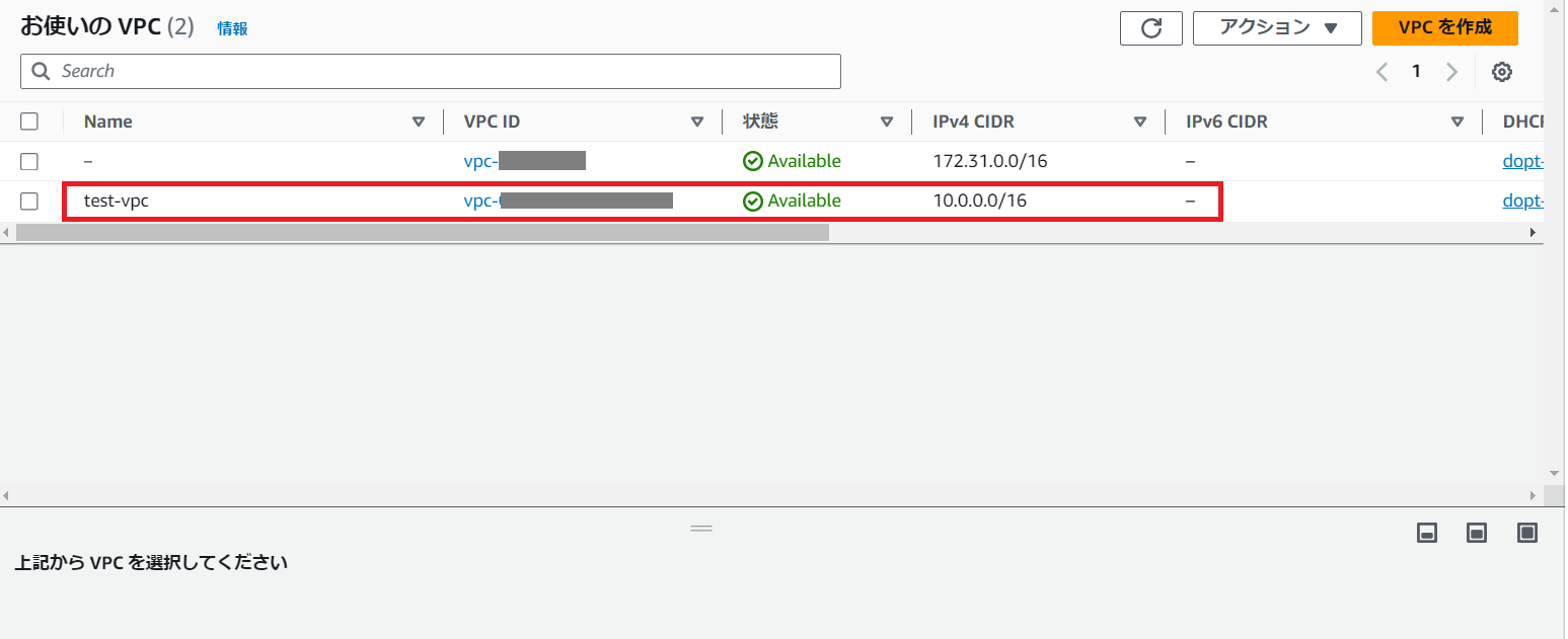VPCの一覧画面でも、新しくVPCが作成されたことが確認できます。