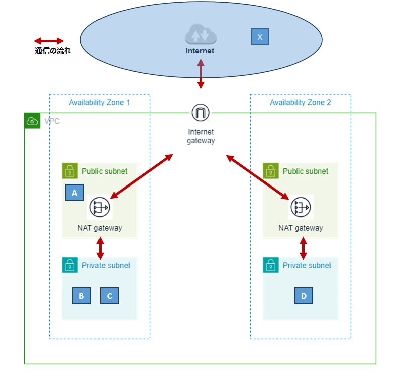 例えば、VPC内に[A]、[B]、[C]、[D]という4つのリソース、外部(インターネット上)に[X]というリソースがあるとしましょう。