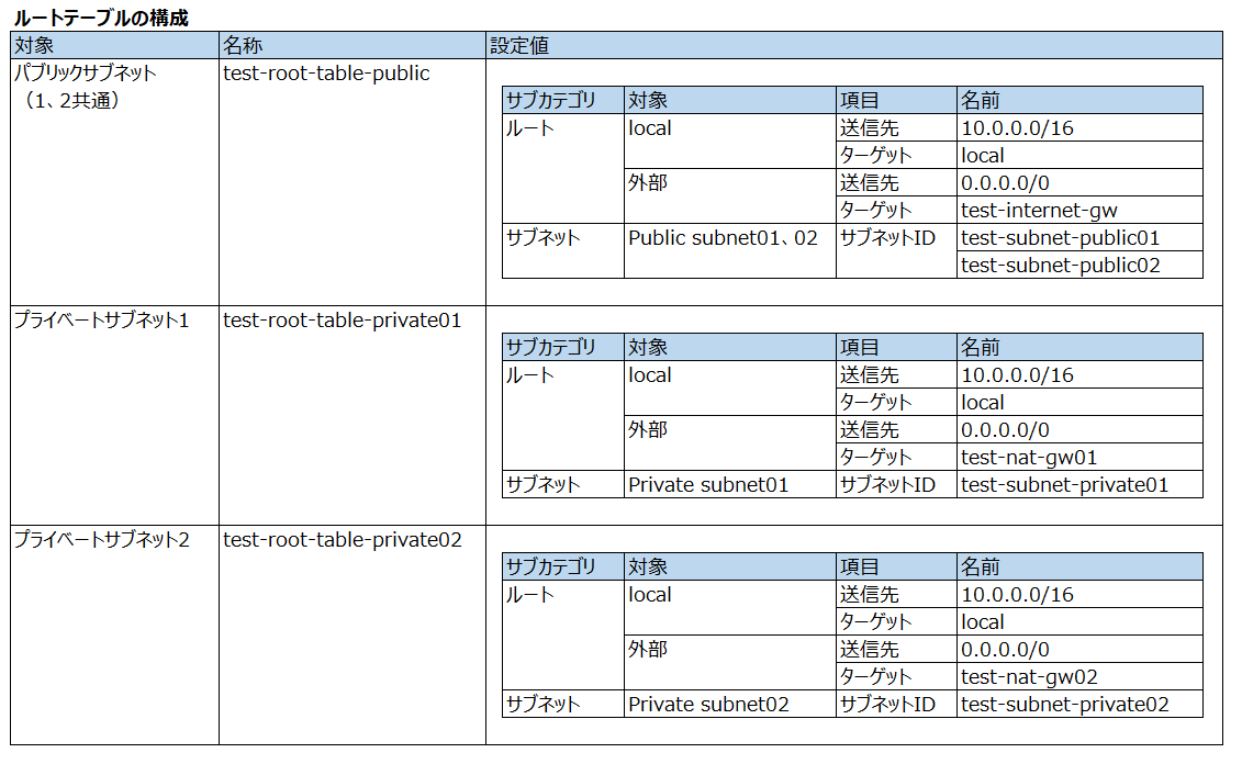 因みに、一つのルートテーブルは複数のサブネットで共有することができるため、今回は以下の構成とします。