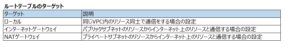 この時、VPC内のリソース同士のルーティングを設定する「ターゲット:local」の設定が同時に作成されます。