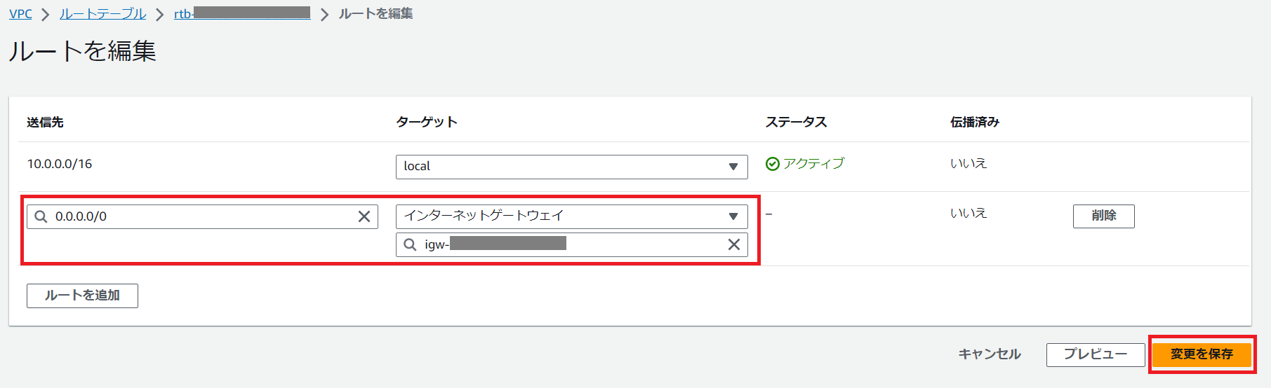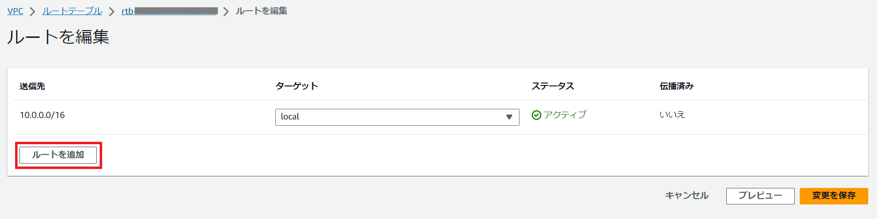 ターゲットがlocalの場合のルート(10.0.0.0/16)はルートテーブル作成と同時に設定されていましたので、外部向けの設定をここで追加します。