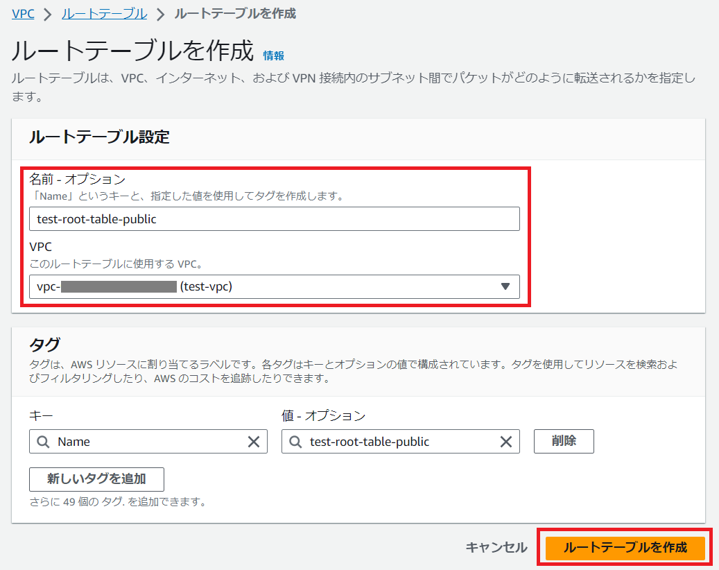 名前は既に決めてあったテーブル名を、VPCについては、現在使用している「test-vpc」を選択します。