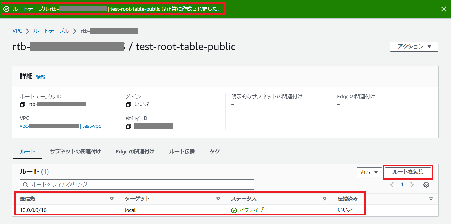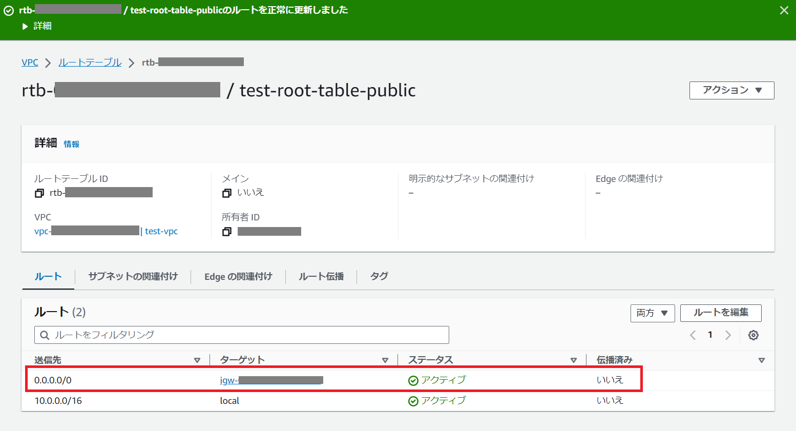 特に問題なければ、ルートテーブル「test-root-table-public」が作成されます。