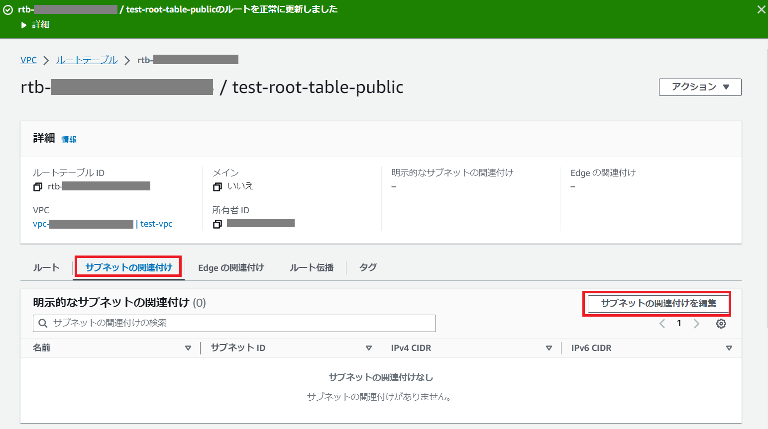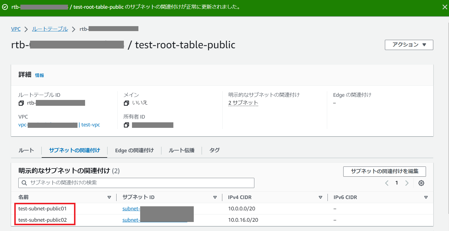 「サブネットの関連付けが正常に更新されました」のメッセージが表示され、選択した二つのパブリックサブネットが関連付けされていることが確認できます。