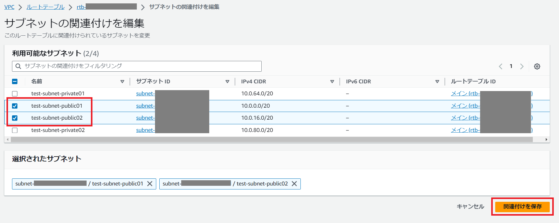 関連付けの編集画面に移動しますので、まずは今回追加する予定の二つのパブリックサブネットを選択しましょう。