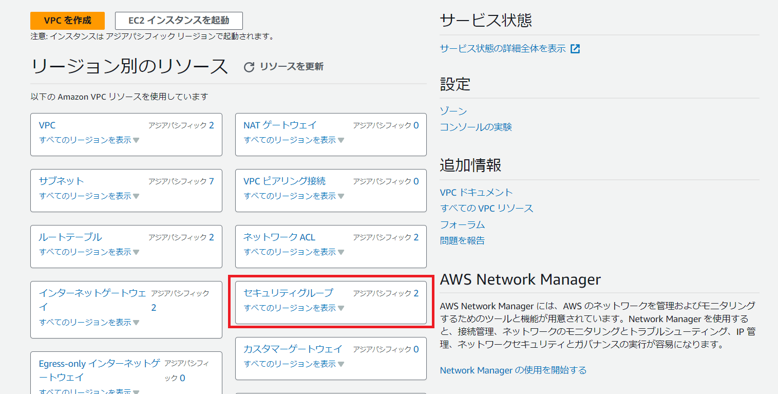 VPCダッシュボード画面より、「セキュリティグループ」を選択し、クリックしてください。