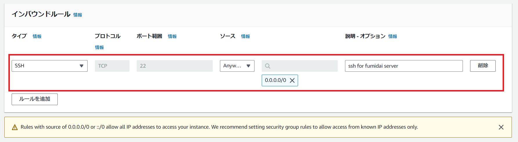今回指定した「Anywhere-IPv4」は、IPアドレスだと「0.0.0.0/0」を意味し、