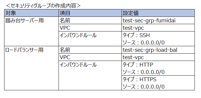 そこで今回は、以下のような内容でセキュリティグループを作成していきます。