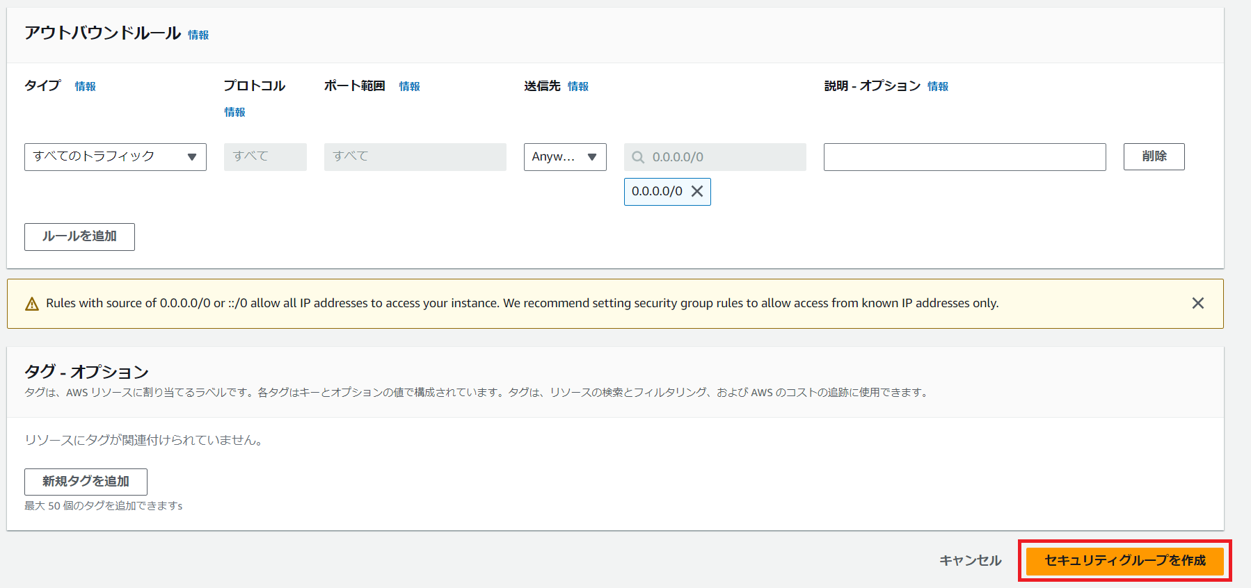 全ての入力が終わったら「セキュリティグループを作成」をクリックします。