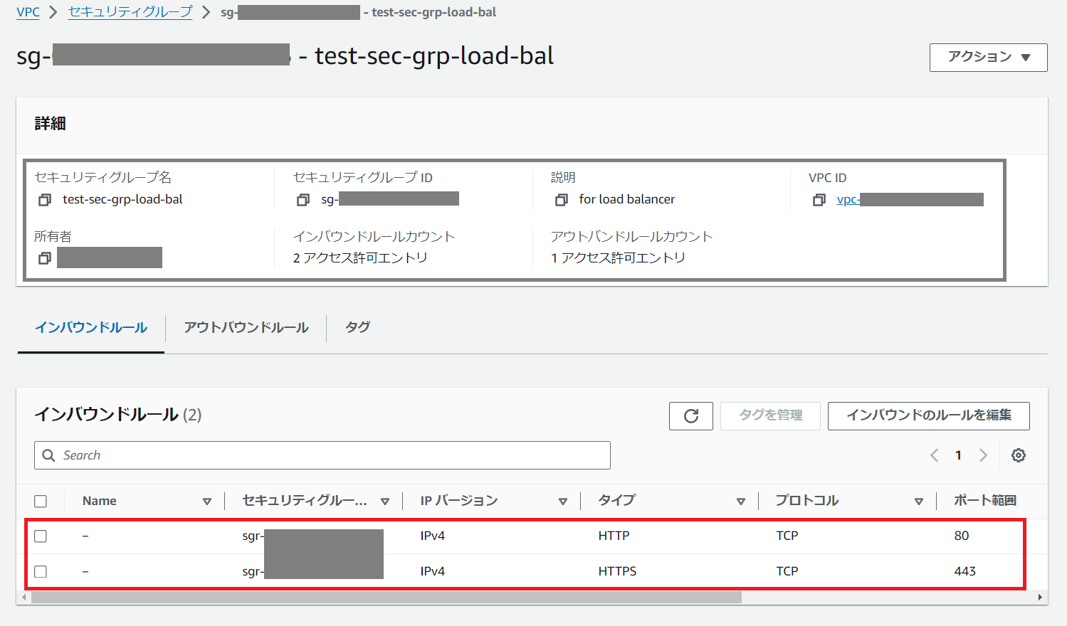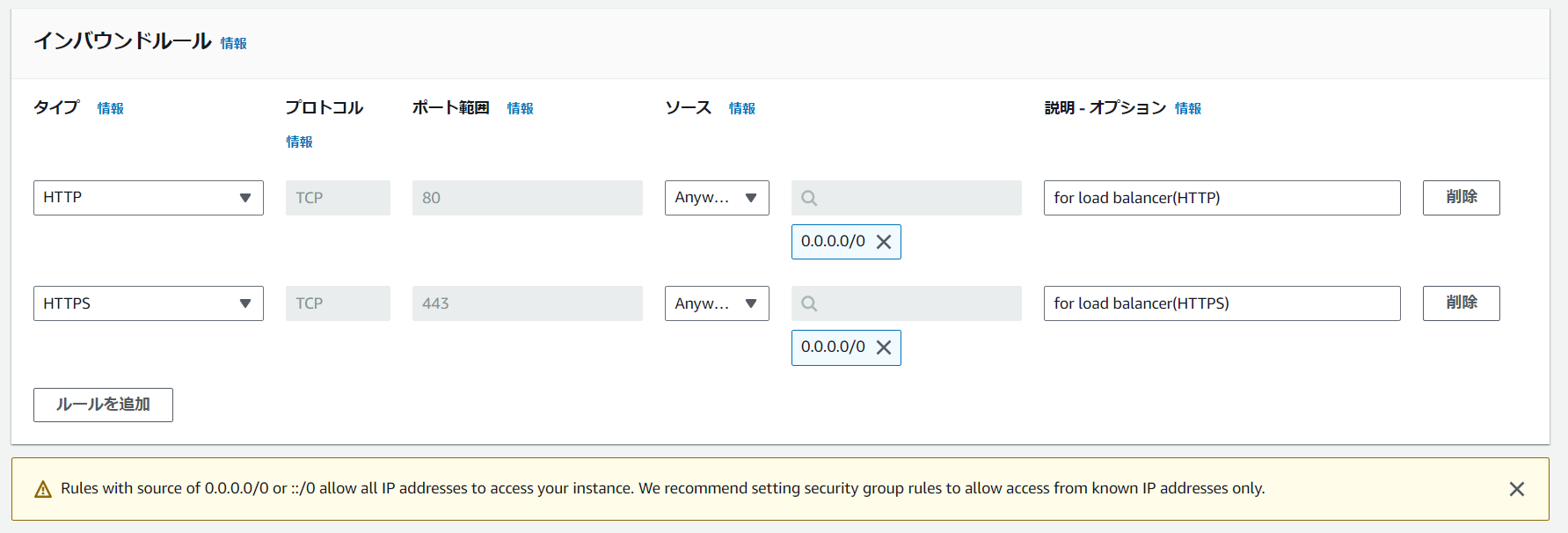 今回は、外部からのHTTP、HTTPSリクエストのみ、全てのIPアドレスに対して許可するインバウンドルール設定とします。