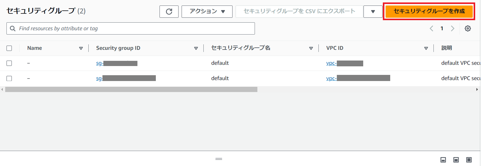 前画面で「セキュリティグループ」をクリックすると、セキュリティグループの一覧画面に移動します。