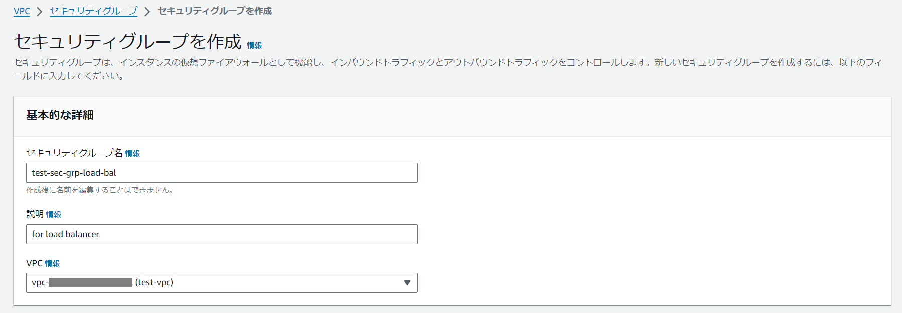 名前は既に決めてあったグループ名を、VPCについては、現在使用している「test-vpc」を選択します。
