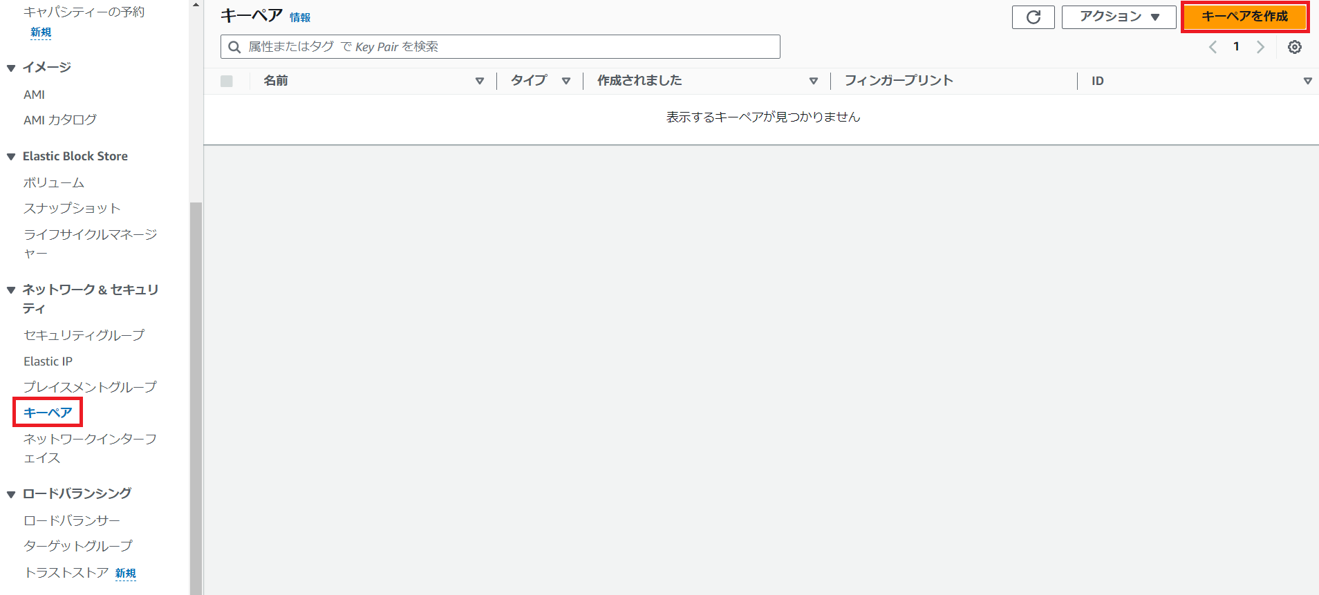 左側のメニュー上あるネットワーク&セキュリティの欄に、「キーペア」がありますので、選択してください。