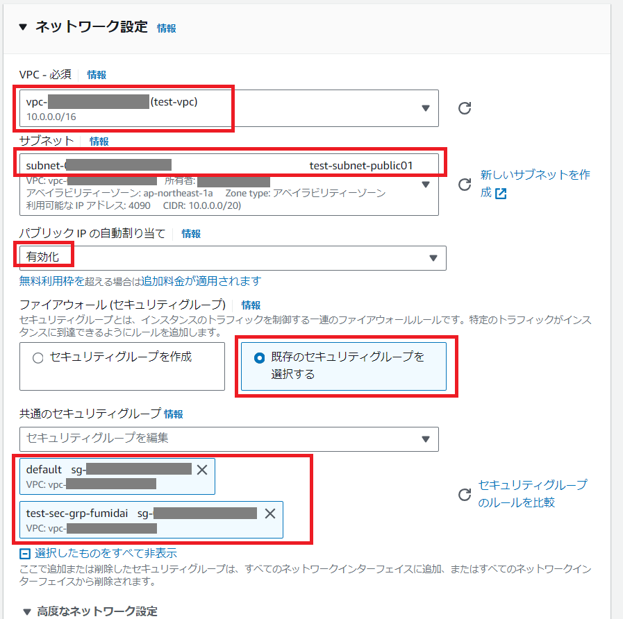 ・共通のセキュリティグループ:default、test-sec-grp-fumidai