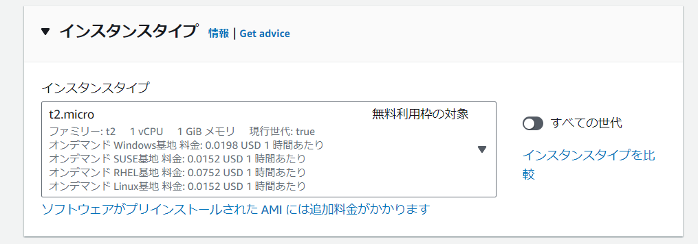 次に決める「インスタンスタイプ」は、CPU、メモリ、ストレージなどの構成です。