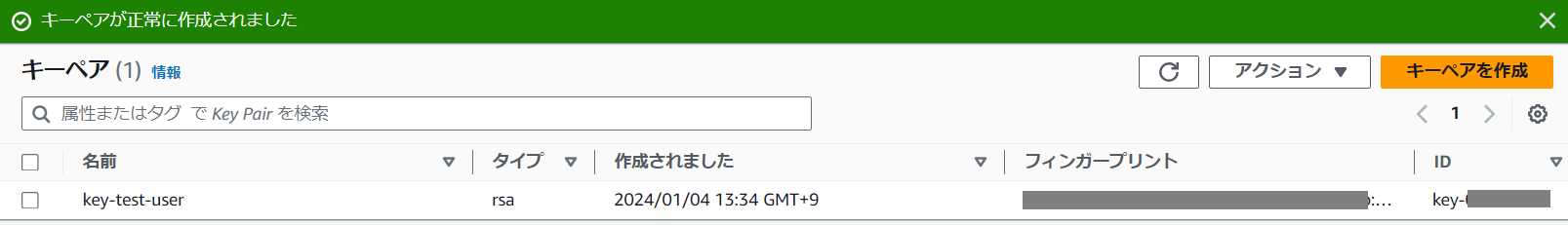 特にエラーがなければ、このように新しいキーペアが作成されます。