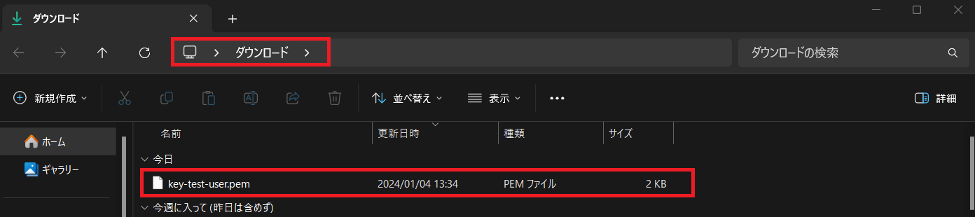 キーペア作成と同時に、PCの「ダウンロード」フォルダにpemファイルが作成されます。