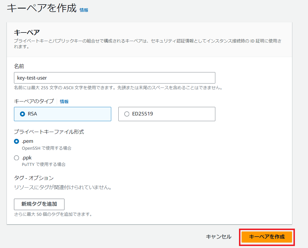 ・名前:キーペアは、ユーザー毎に割り当てられるものなので、なるべく個人を識別できる名称にしてください。