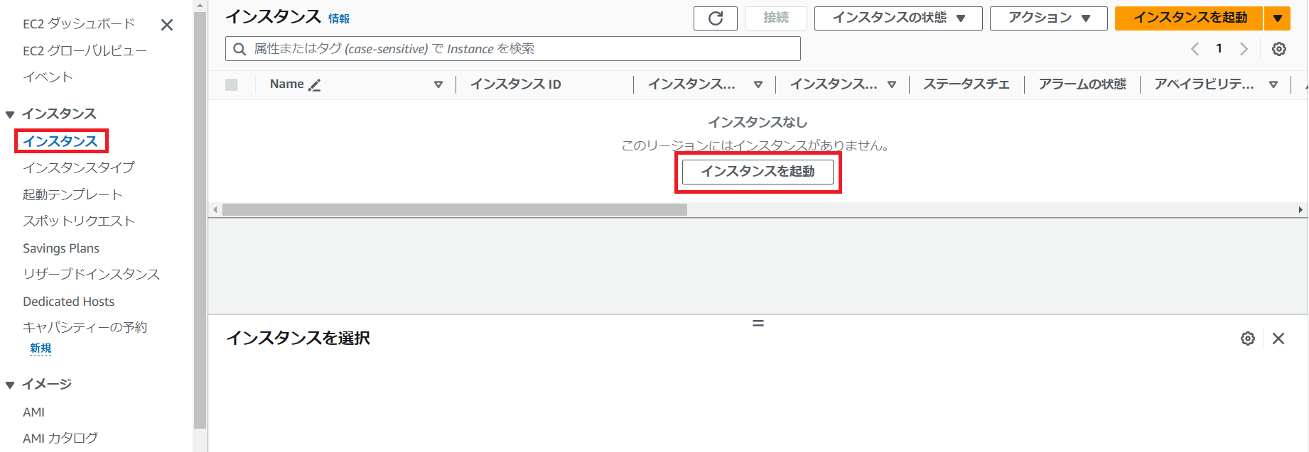 EC2のダッシュボード画面から「インスタンス」を選択すると、インスタンスの一覧画面に移動できます。