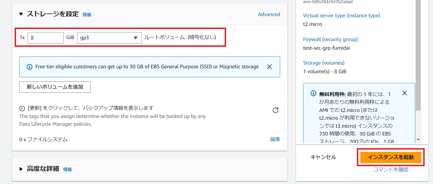 最後に「ストレージ(EC2に割り当てるディスク容量)」を決定します。