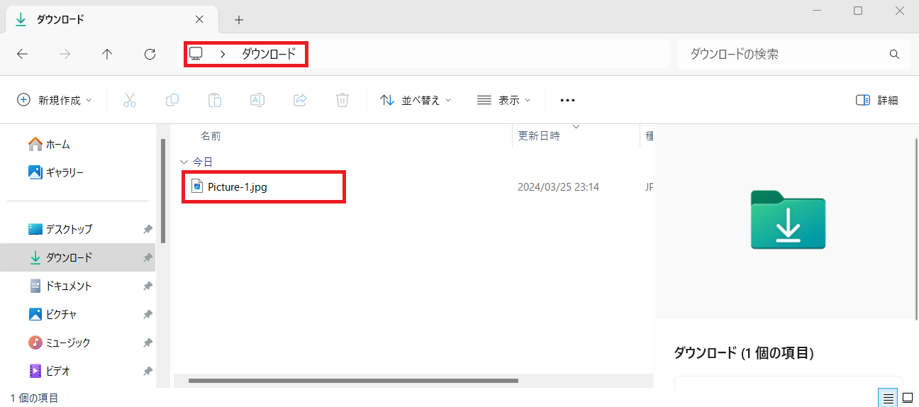 ローカルPCのダウンロードフォルダを確認すると、「Picture-1.jpg」がダウンロードされていることが確認できます。