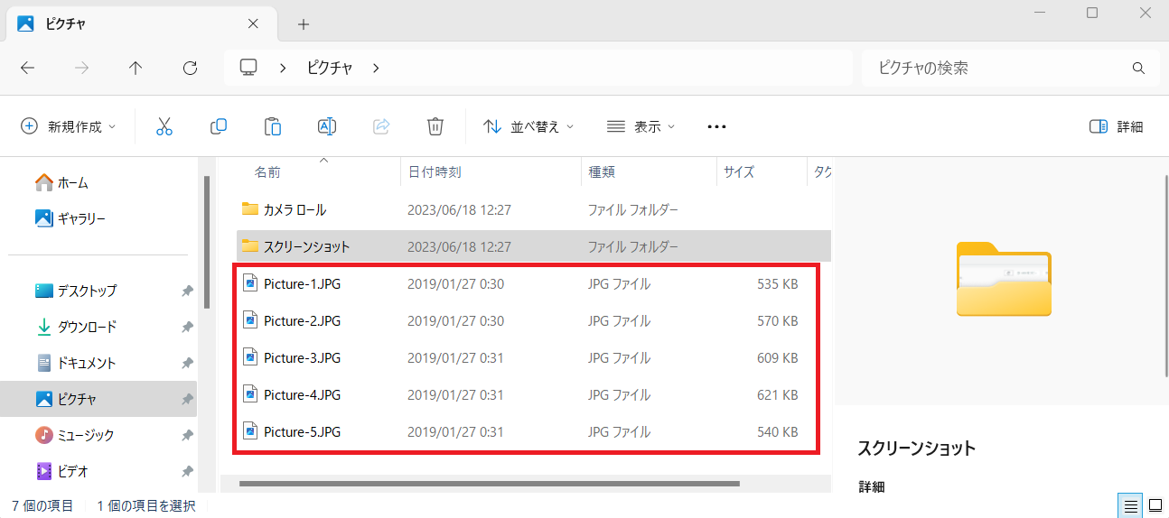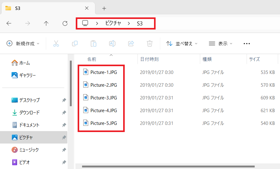 今回、PCの「ピクチャ」フォルダに5枚の画像ファイルを用意しましたので、これをオブジェクトとして利用し、S3操作を実践しようと思います。