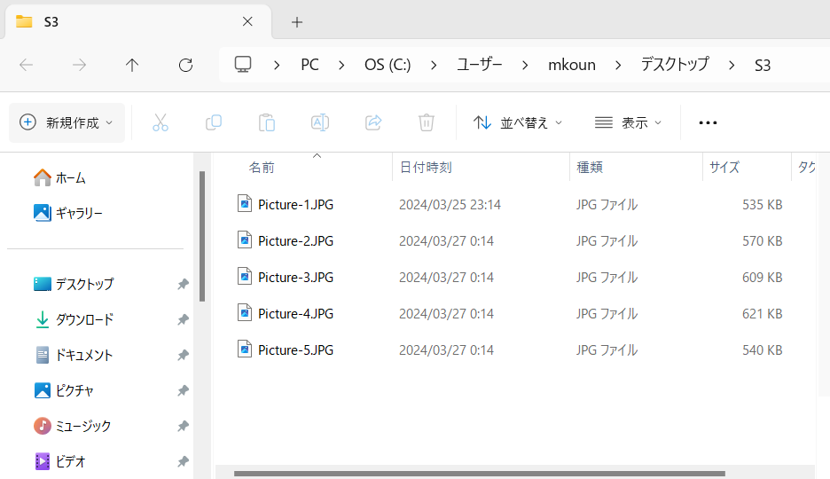 事前準備としてローカルPCのデスクトップ上に「S3」というフォルダを作成し、中に画像ファイルをいくつか格納しておきます。
