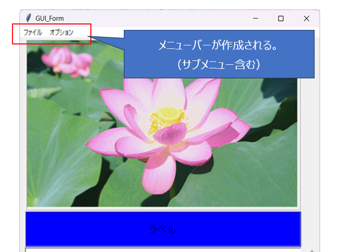 menubar.add_cascade(label='オプション', menu=optionmenu)今回は、ファイルメニューのほかに「オプション」メニューも作成してみます。(上記参照)