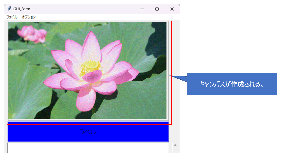 Canvasウィジェットは、円や直線、楕円といった図形や、画像ファイルを配置できる領域となります。