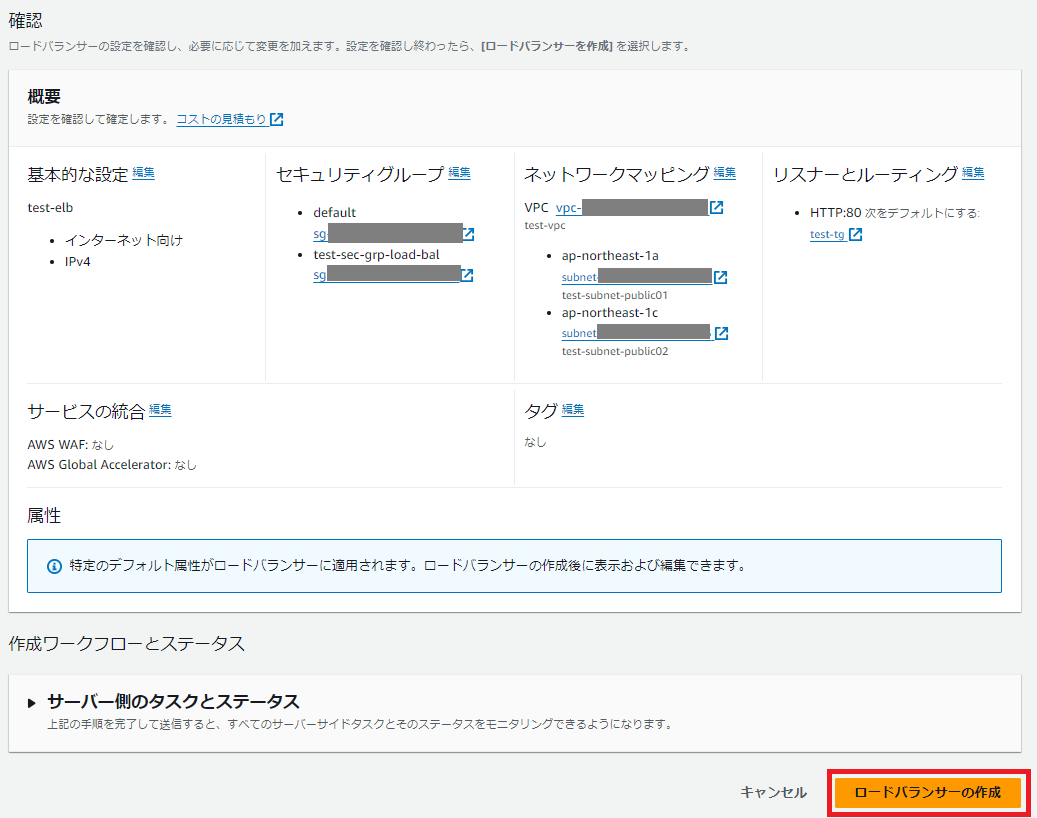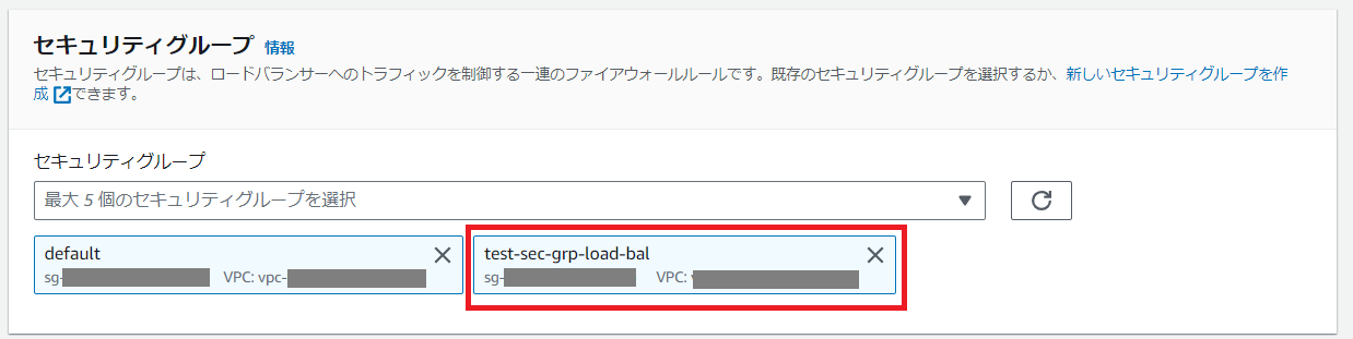 セキュリティグループについては、こちらの記事で作成した「test-sec-grp-load-bal」を追加で選択しましょう。