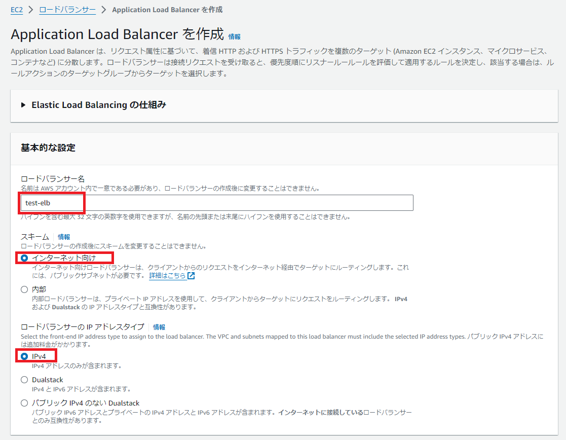 まずはロードバランサー名の指定ですが、今回はサンプルとなりますので、名前は「test-elb」とります。