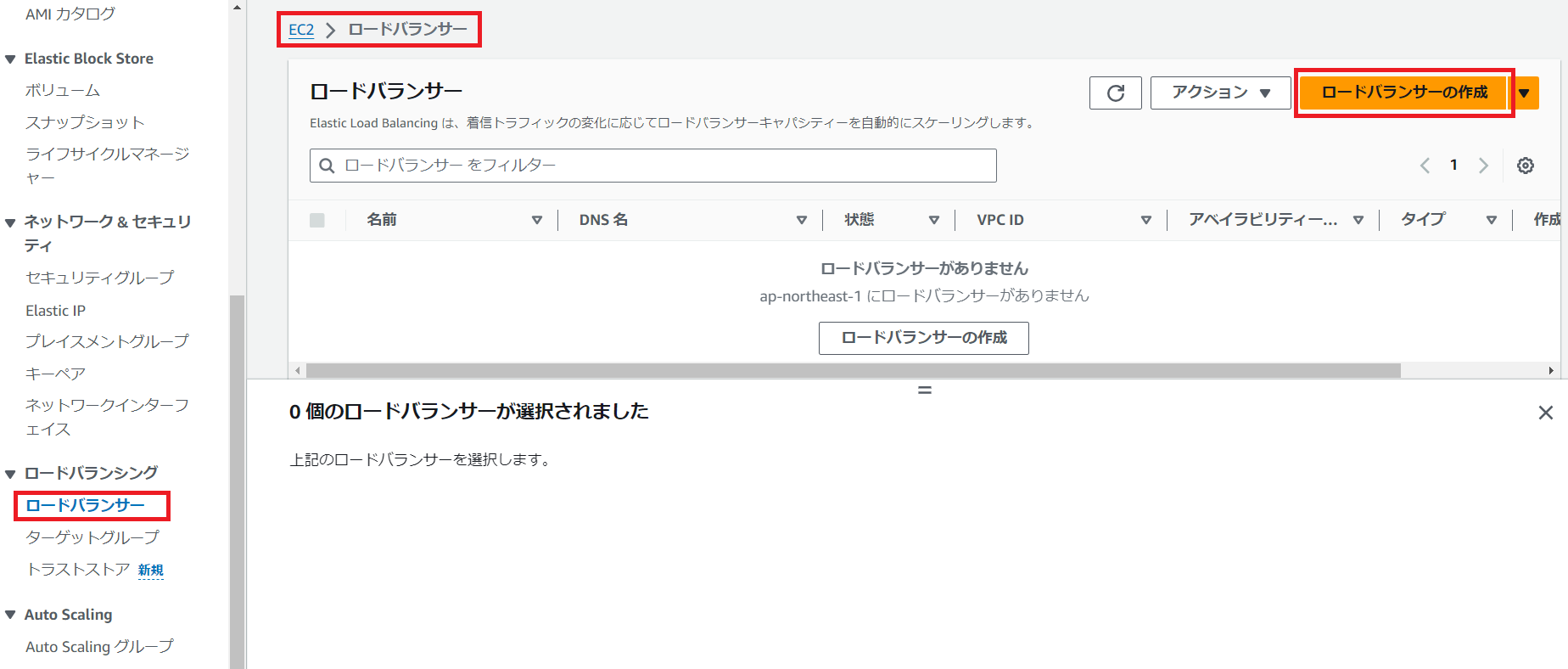 この時点では、まだロードバランサーを作成していませんので、一覧には何もない状態です。