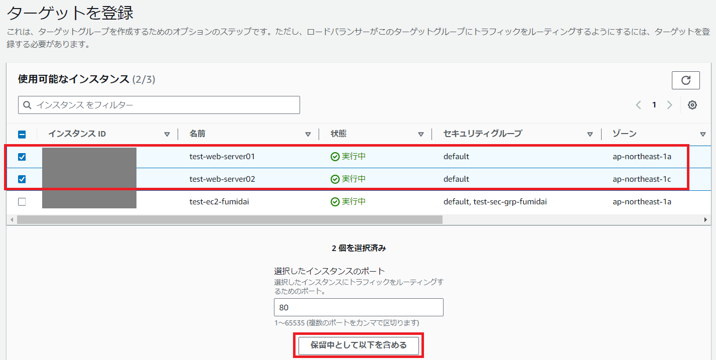 ここでは、ロードバランサーがターゲットとするEC2インスタンスを選択します。