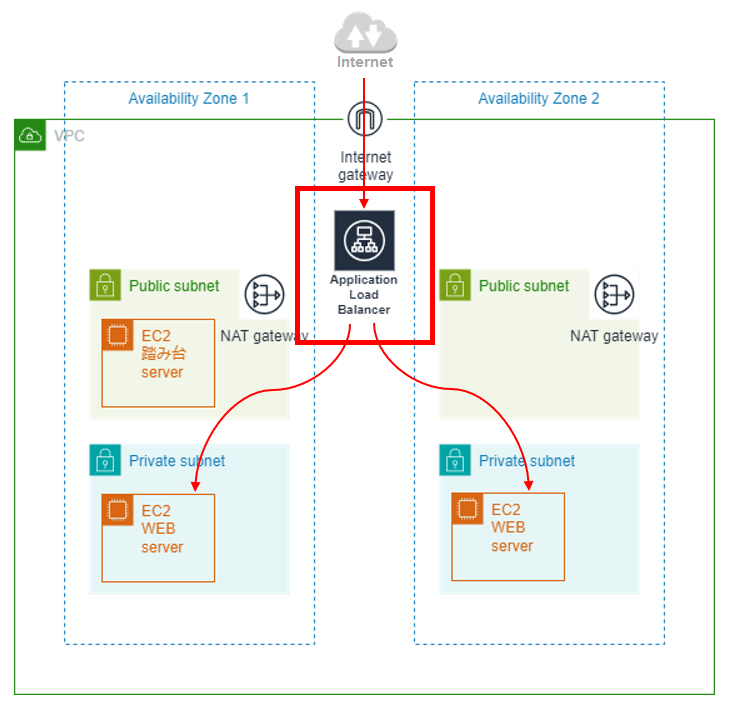 ALBの配置イメージは、以下の図の通りとなります。太い赤枠の部分がALBです。