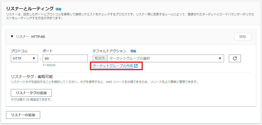 次は「ターゲットグループ」の設定になるのですが、この時点ではターゲットグループがまだ作成されていません。