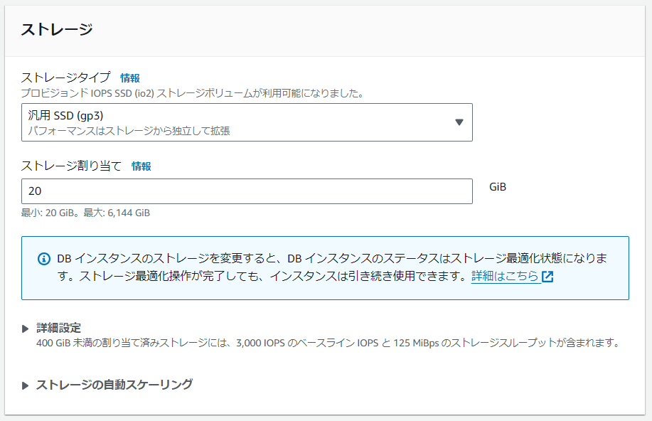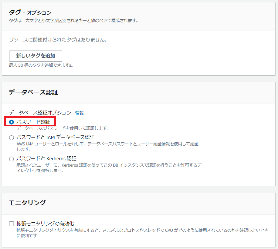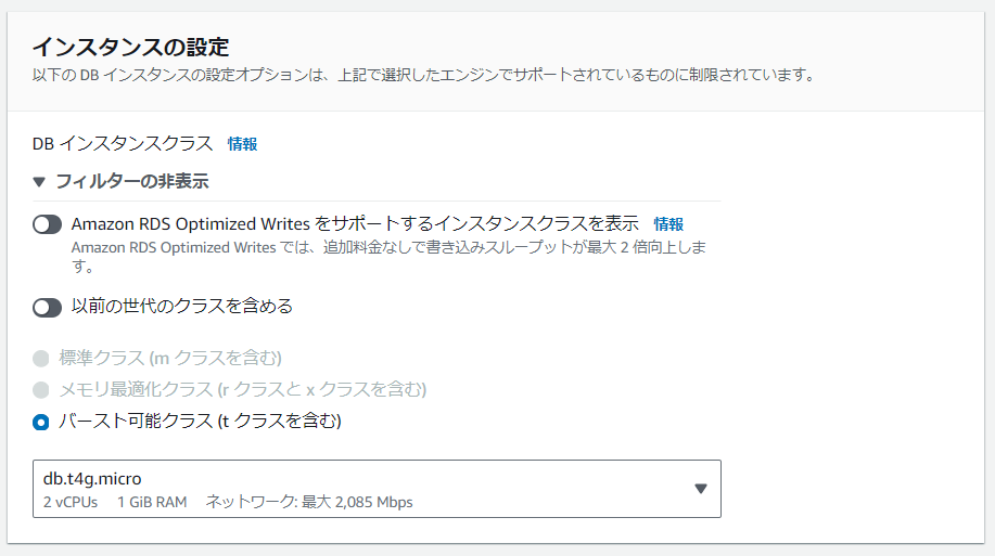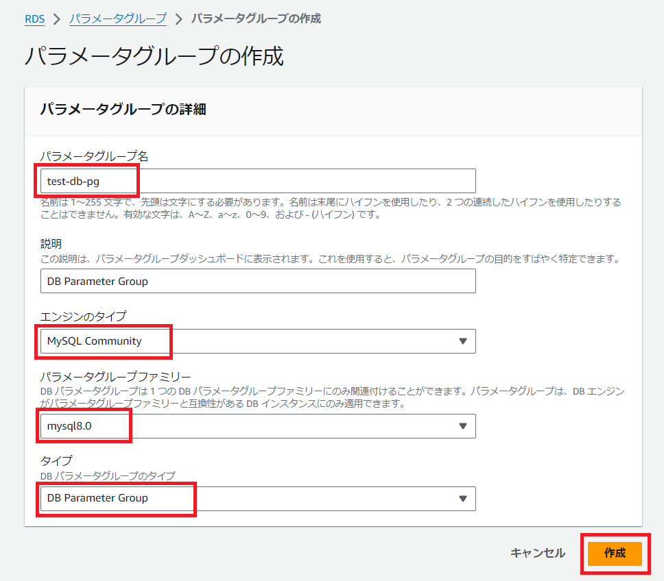 ちなみに、「タイプ」については、選択するエンジンタイプ/パラメータグループファミリーの組み合わせによっては選択不要となる場合もあります。