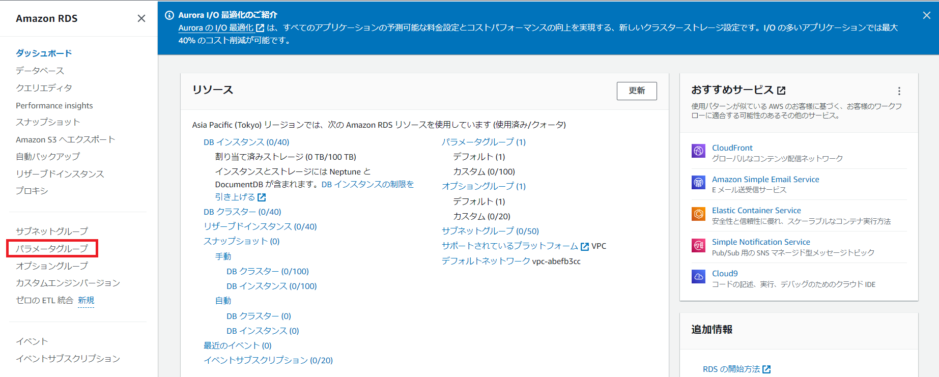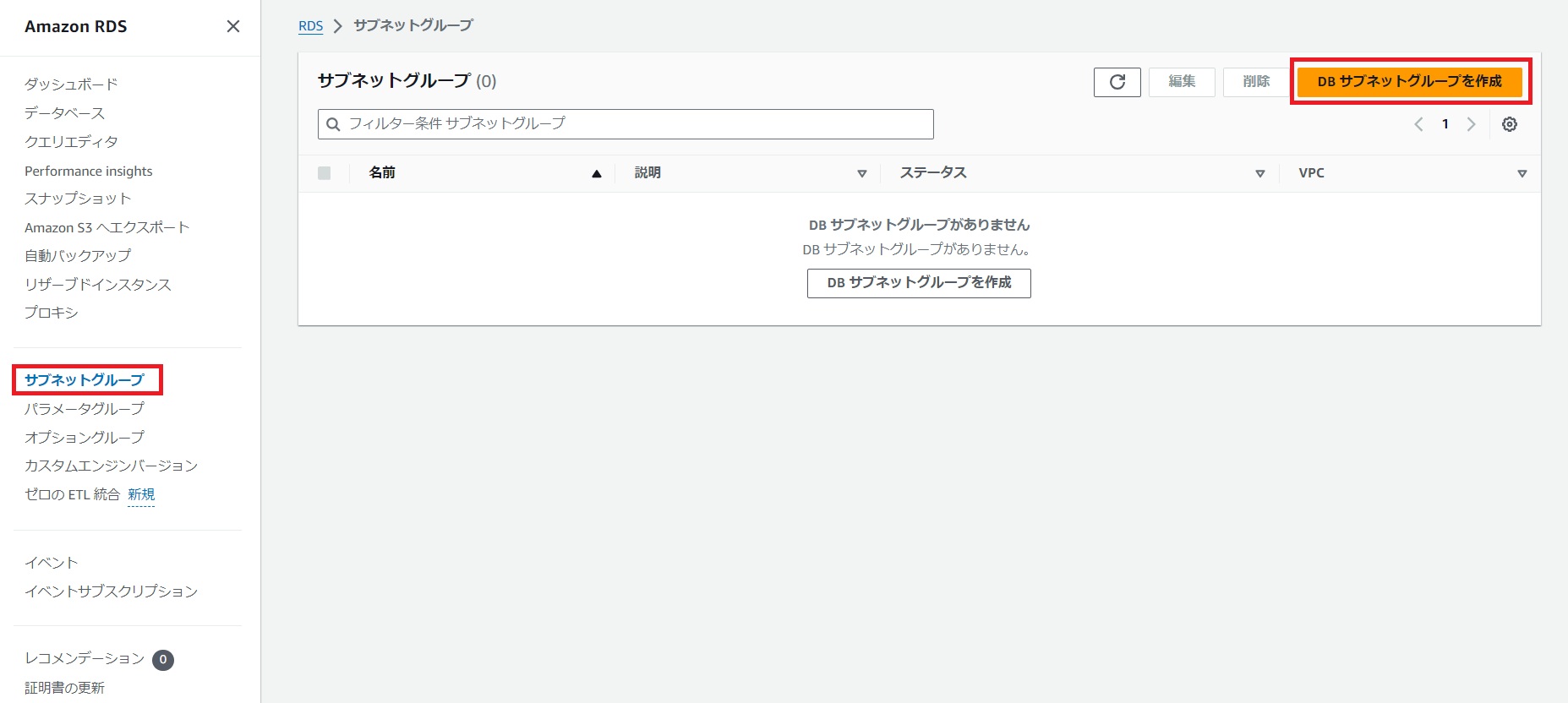 この画面がダッシュボード画面となります。ここからRDSの各グループを設定していきましょう。