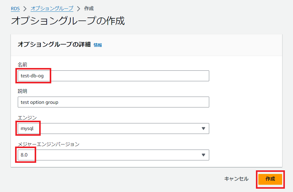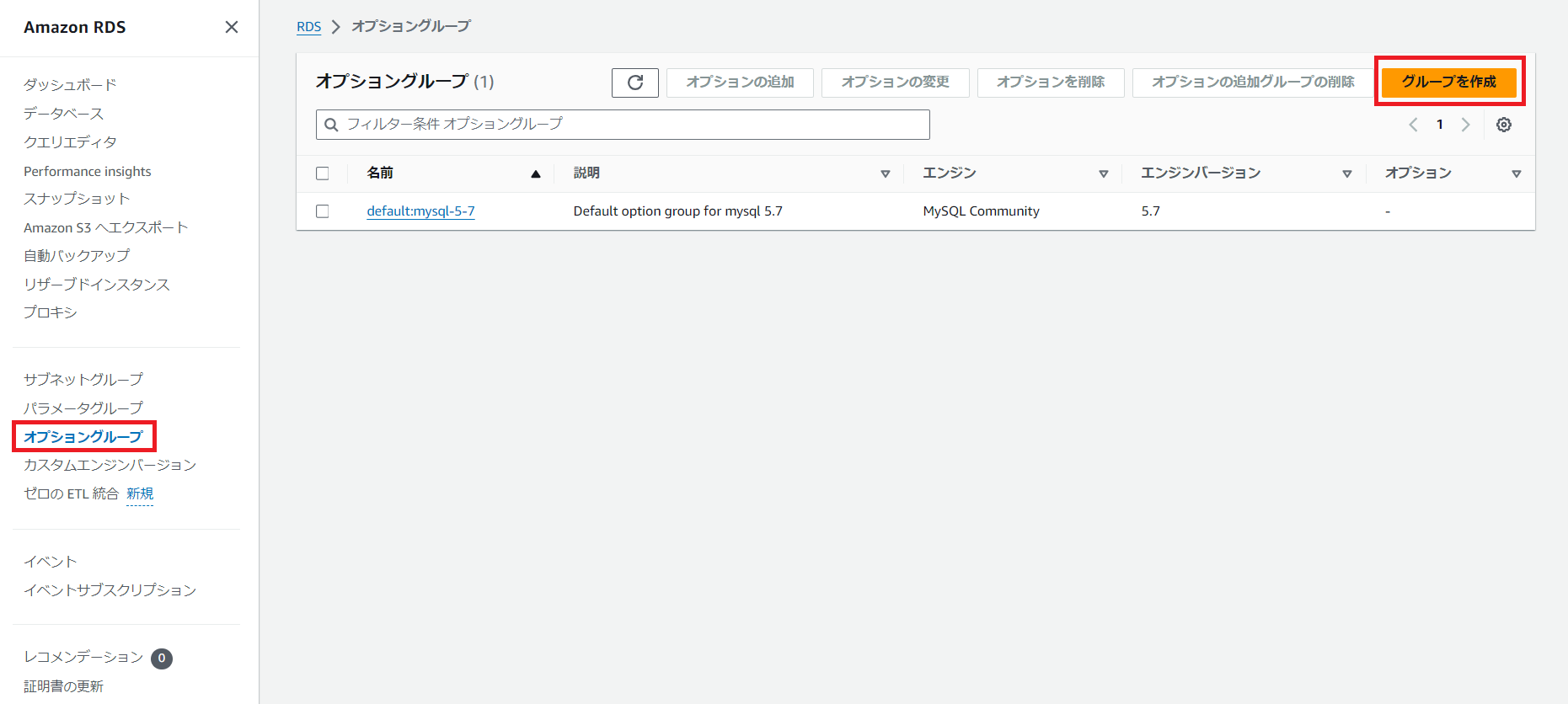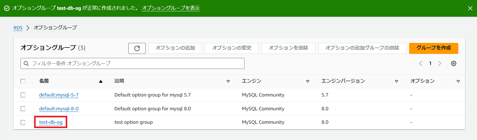 因みに、初期状態ではデフォルトのオプショングループが存在しますが、今回は使用しませんので、「グループを作成」をクリックし、新規作成します。