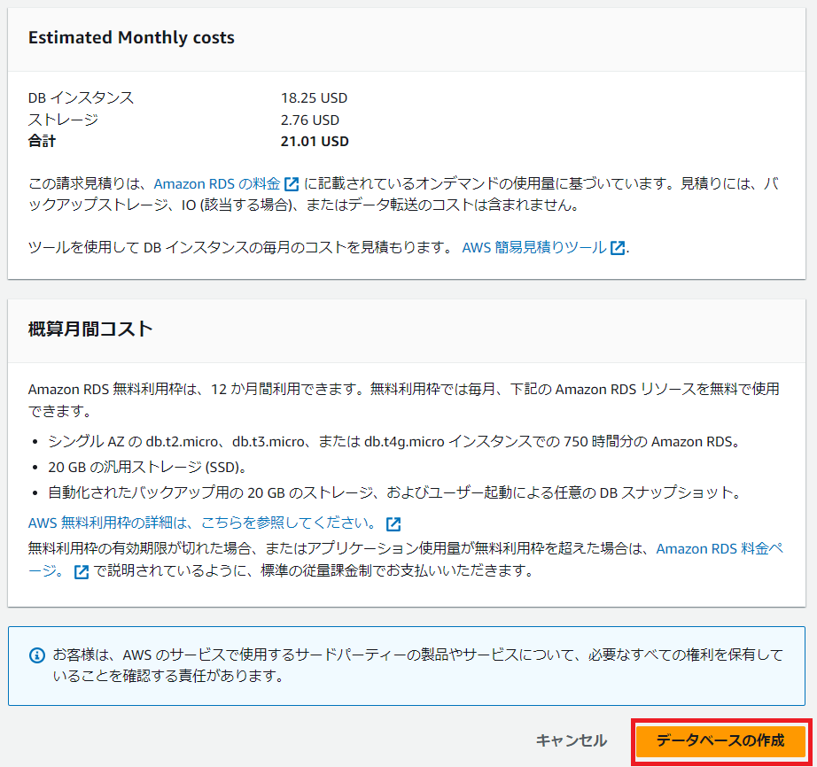 今回、RDSを利用してDBサーバを作成しました。