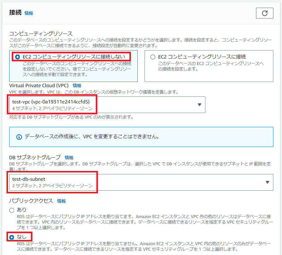 因みに、本記事でのDBサーバの作成方法は、最もシンプルな形で行いましたので、実際にDBサーバを構築する際は、もう少し設定を深堀する必要もあると思います。