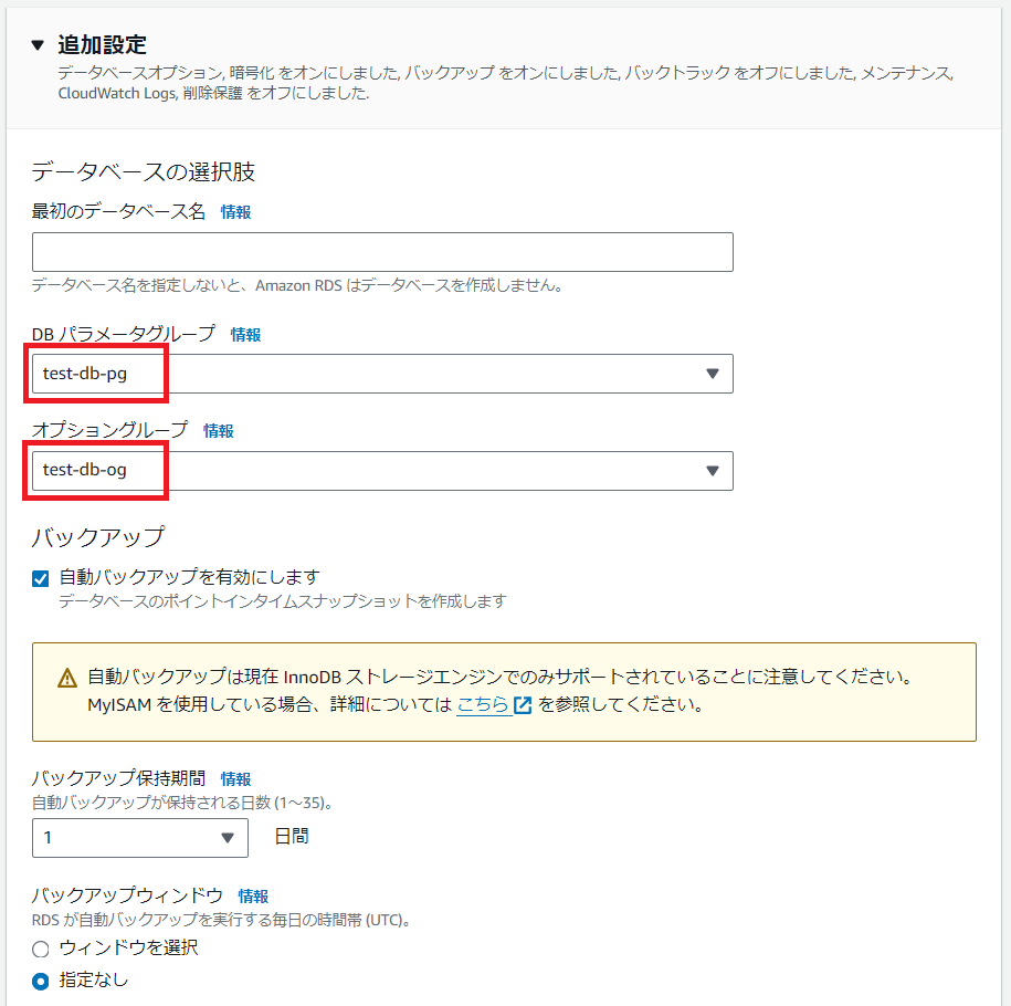 ここまでで、パラメータグループ、サブネットグループ、オプショングループの3つのグループが作成できました。